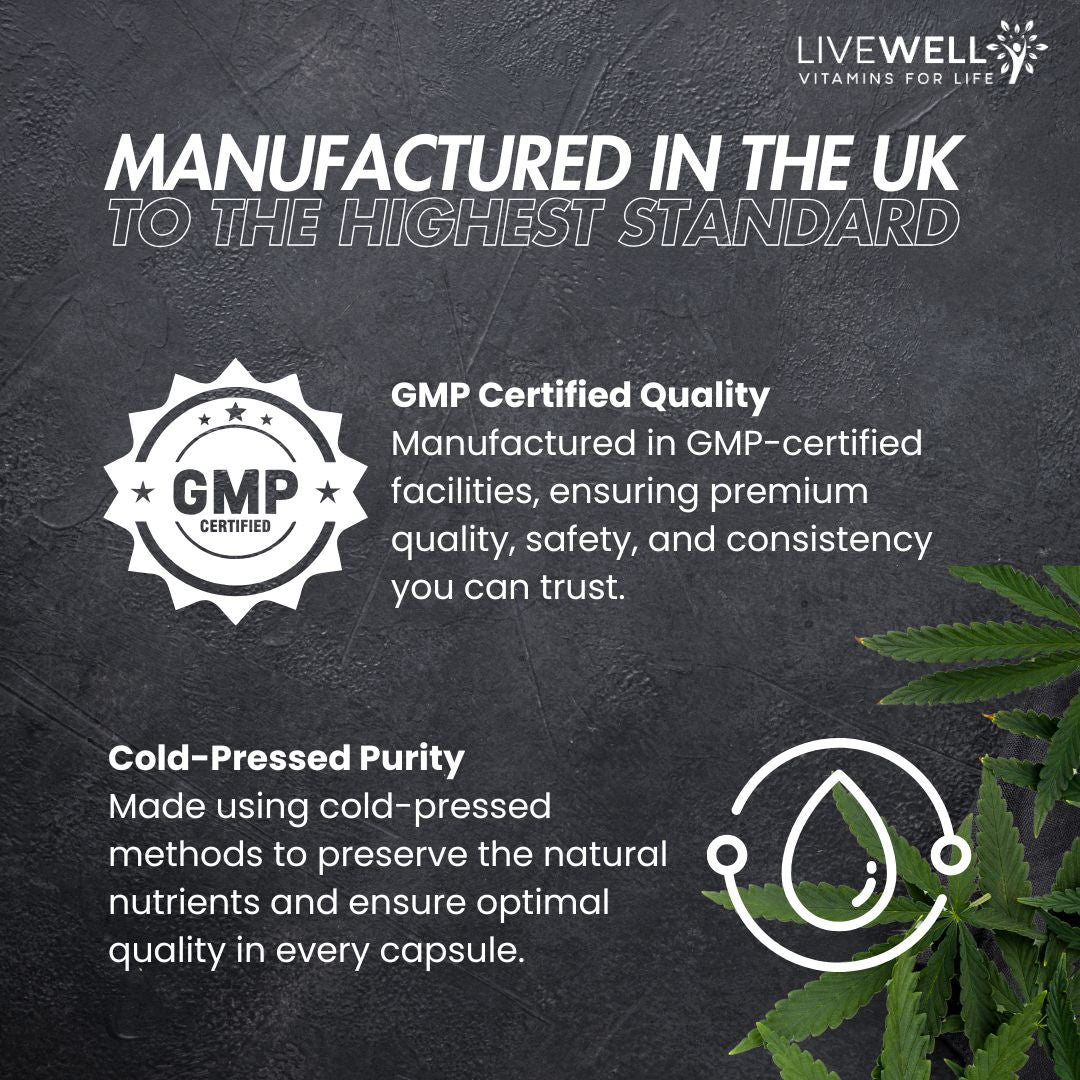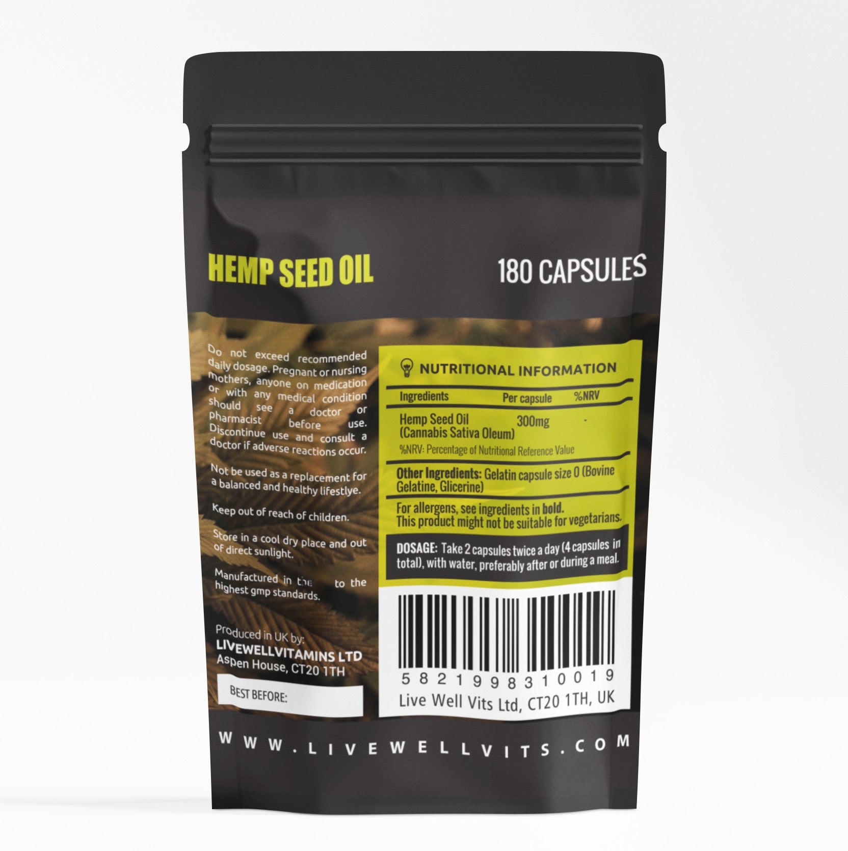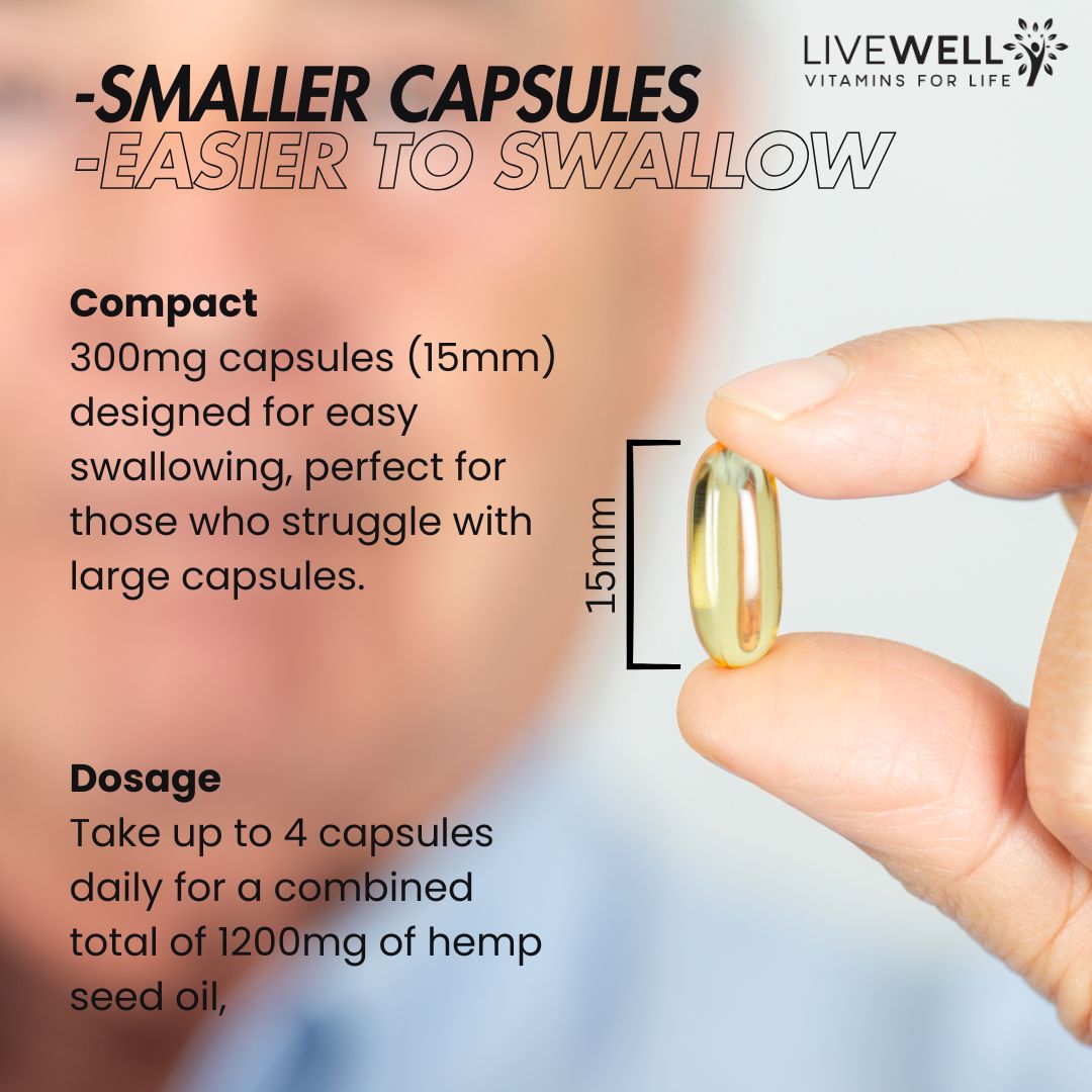 LiveWell's Hemp seed oil capsules are supplied in 300mg capsules for an easy-to-swallow capsule, our 300mg capsules are less than a third of the size of 1000mg therefore much easier and pleasant to take.